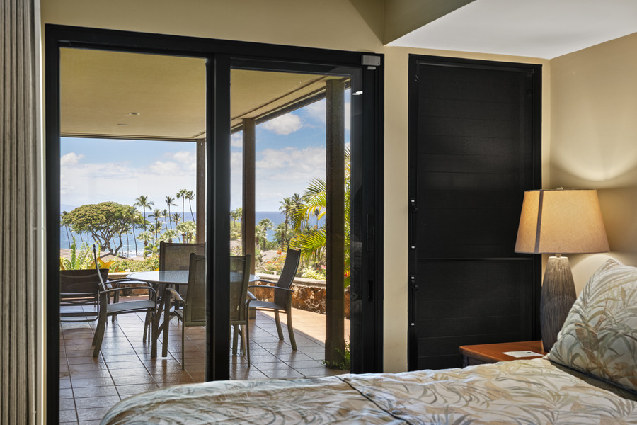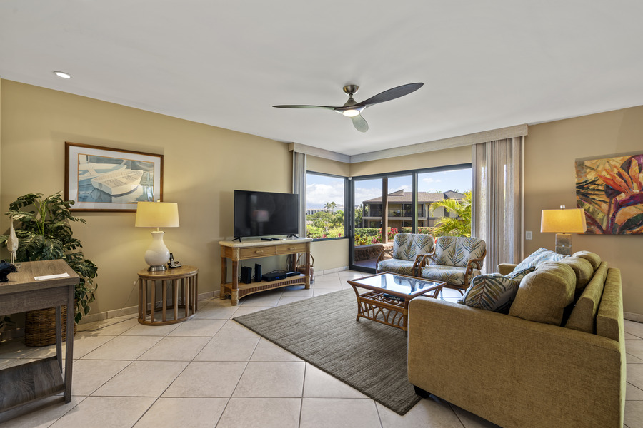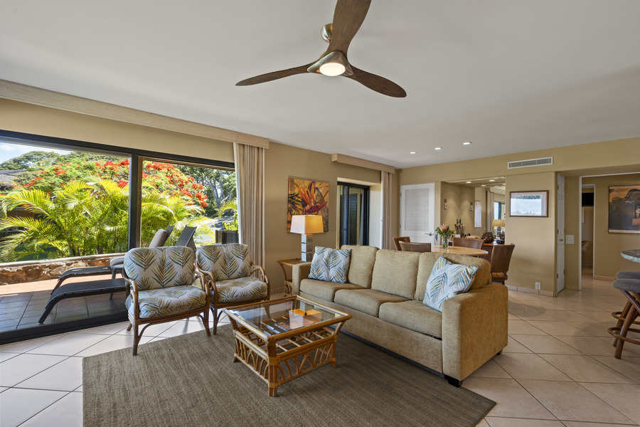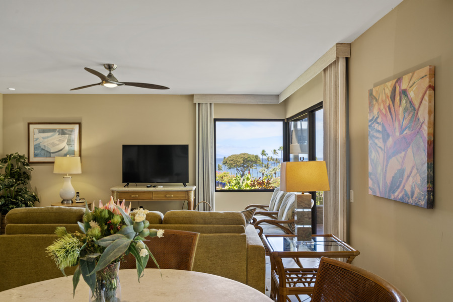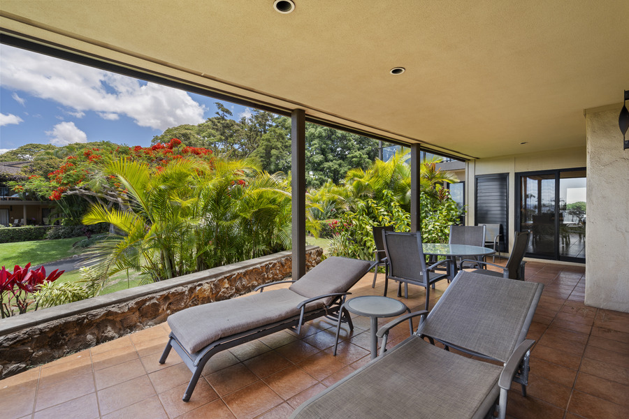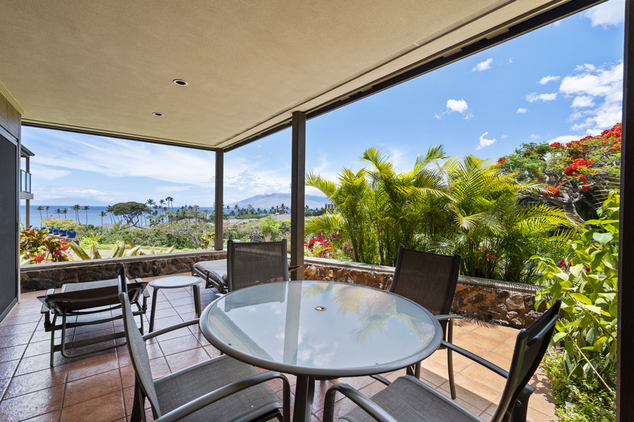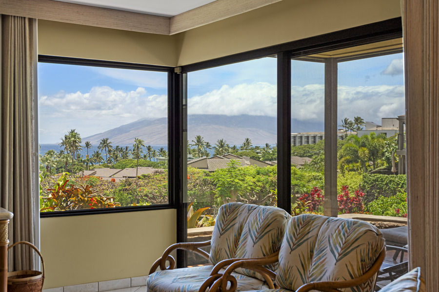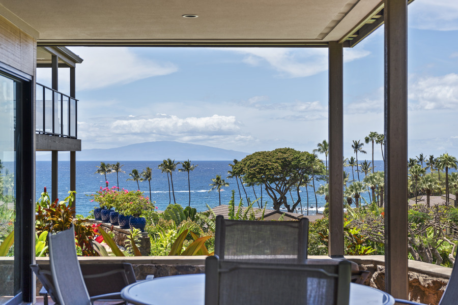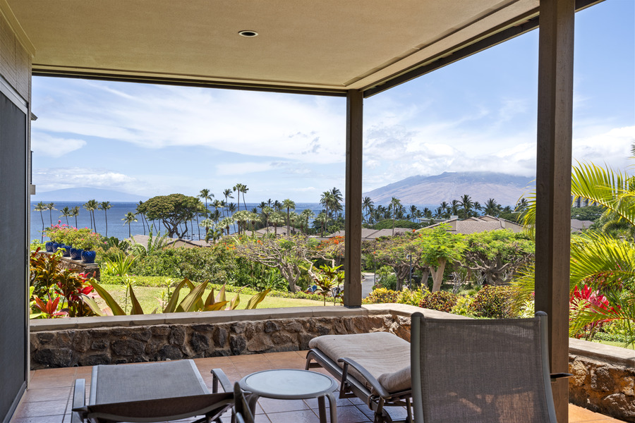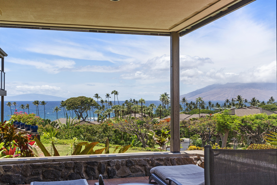 Our large lanai, living room, and master bedroom are ocean-facing, with a spectacular panorama of ocean and the West Maui Mountains framed by plumeria, bougainvillea, and palm trees.