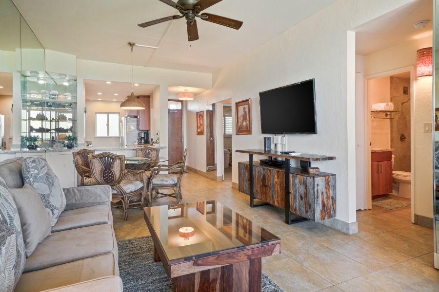 Welcome to Menehune Shores #623, a beautifully remodeled penthouse that offers soaring ceilings and breathtaking views of both the ocean and mountains. This top-floor retreat blends modern upgrades with the timeless spirit of Old Hawai‘i.
