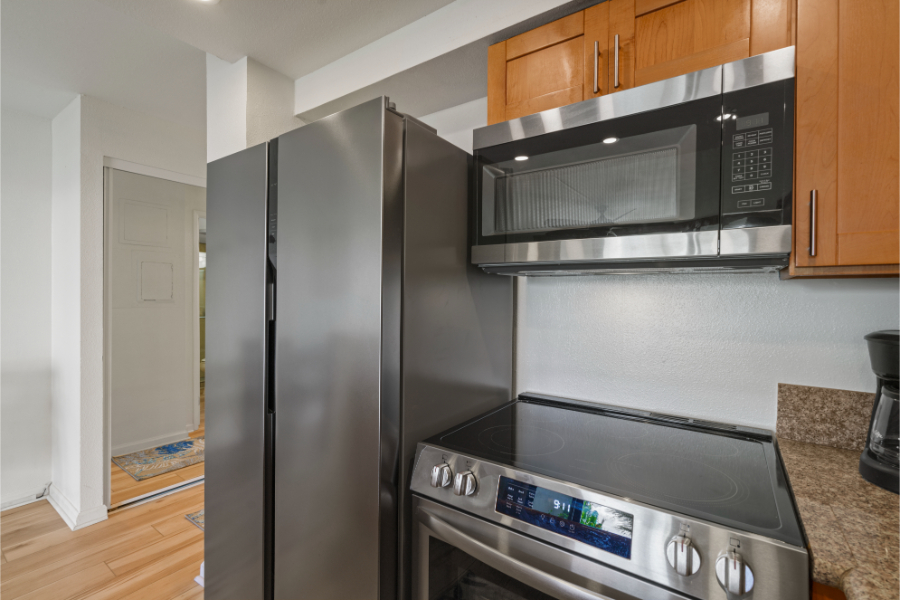 • Full-size refrigerator, stove, oven, microwave, and dishwasher