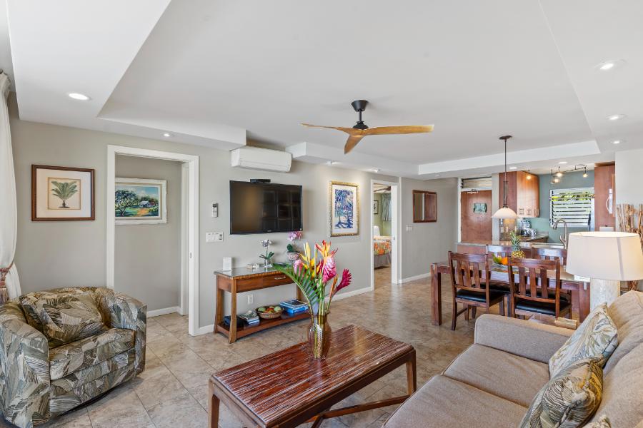 Royal Mauian #207 is a two-bedroom, two-bathroom condo offering stunning ocean and coastline views from its private lanai. Perfectly situated along Maui’s south shore, this beautifully updated retreat features split-duct air conditioning, a comfortable layout, and direct access to golden sand beaches just steps away. Whether you’re relaxing indoors, snorkeling at the reef, or watching a breathtaking sunset, this condo provides everything you need for a memorable Maui getaway.