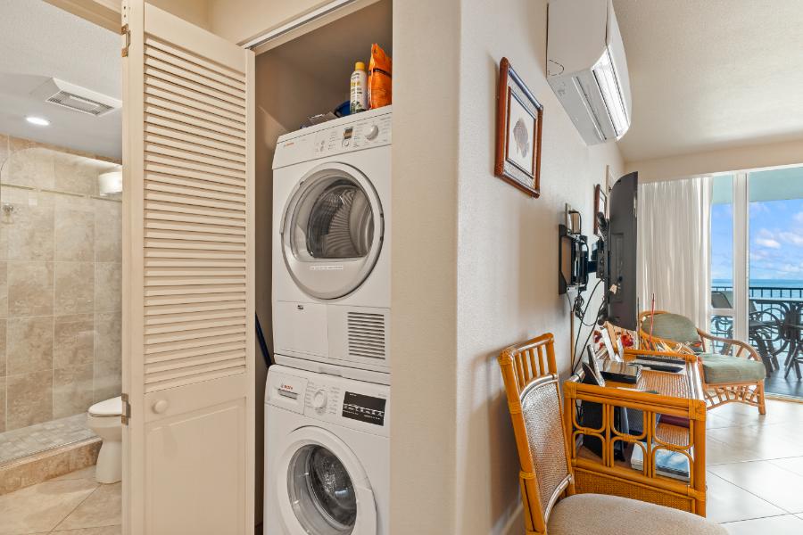 “Welcome to our tropical paradise! After staying in many different condominiums over the years, we have tried to incorporate everything important to us into our condo. There is air conditioning for added comfort, although the cross breezes are wonderful. We have an open, modern kitchen with appliances and everything you will need for cooking. In the laundry closet, you will find a Bosch stackable washer and dryer.