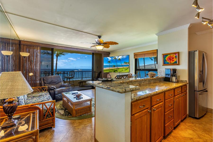 Welcome to Sugar Beach Resort #414, a rare one-bedroom, one-bathroom oceanfront corner unit with panoramic views of the pool, BBQ area, and the golden sands of Sugar Beach stretching for miles. Located on the fourth floor, this beautifully upgraded condo is designed for relaxation, comfort, and unforgettable Maui memories.