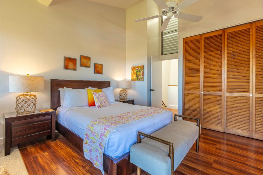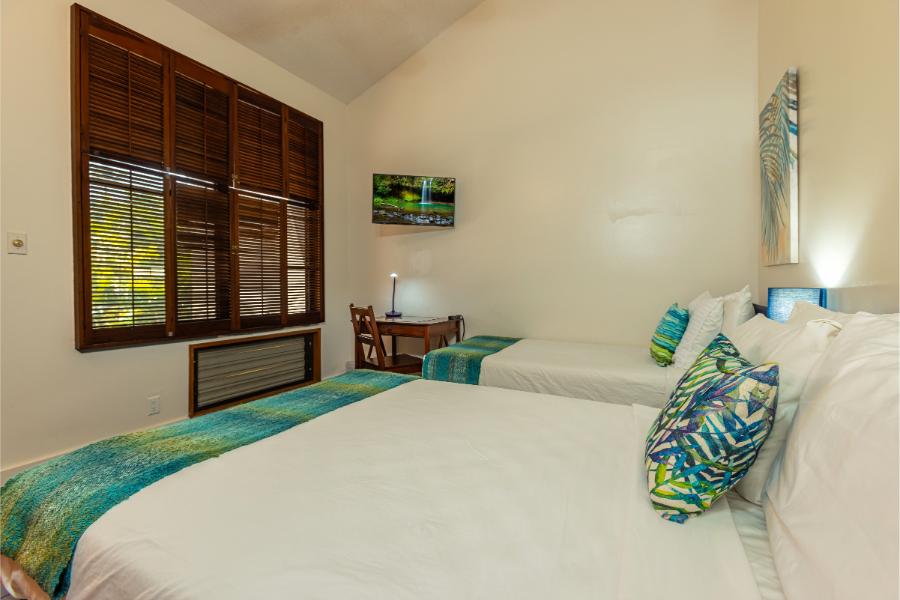 - Guest Bedroom: Full and twin bed, ensuite bathroom, AC, ceiling fan, work desk, and smart TV, with views of Mount Haleakala.